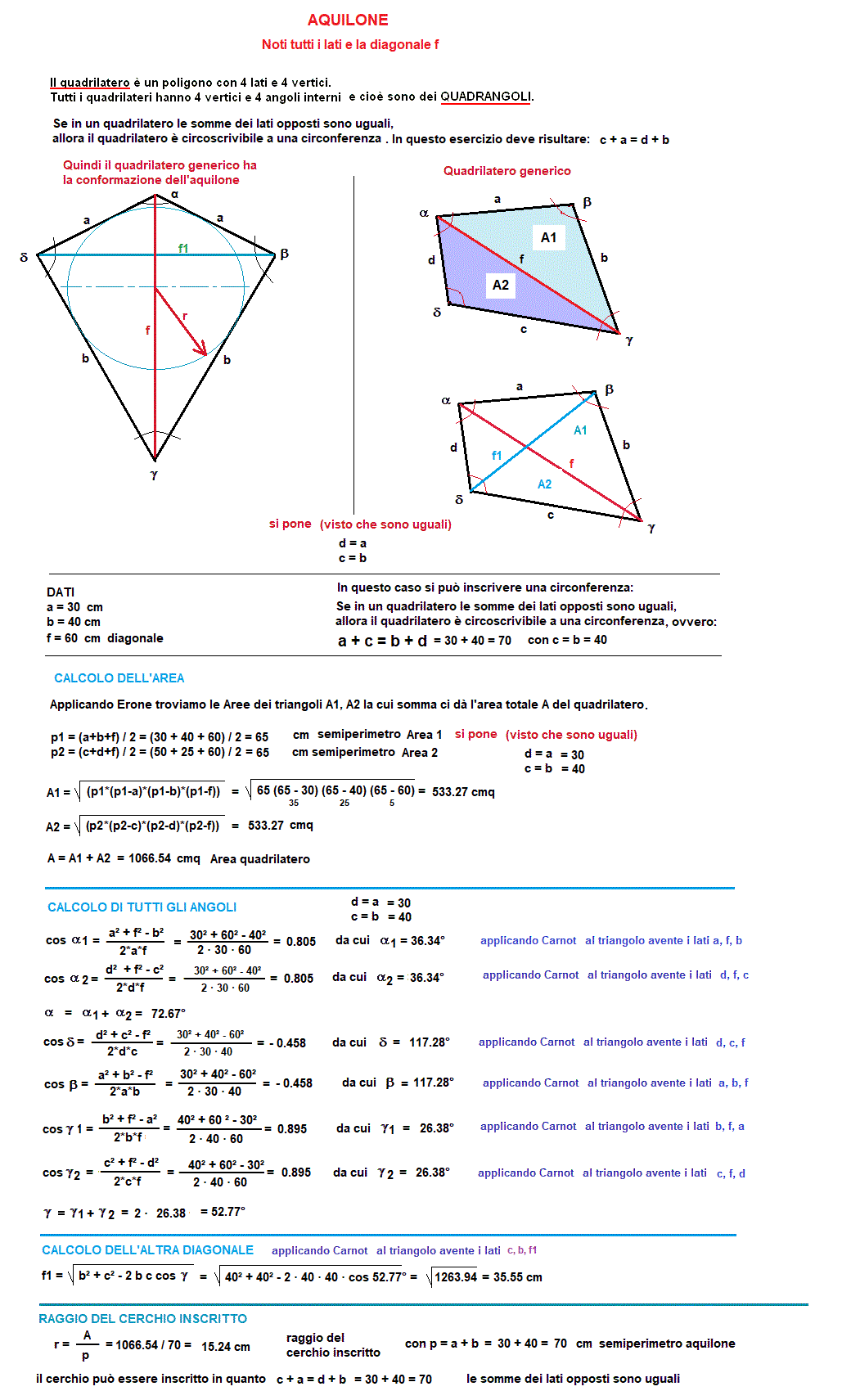 Calcolo Aquilone area, angoli, diagonale - calcolo con 2 triangoli
